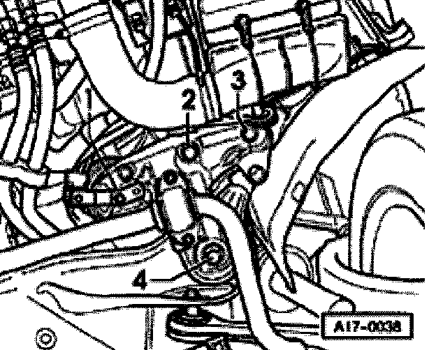 - Remove front subframe bolts -2- and -3- on left and right-hand sides. Then remove bolts -4-.