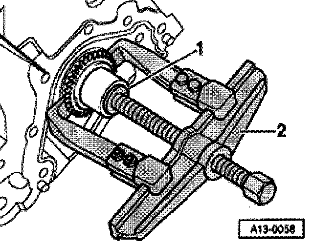- Position a suitable washer -1- under puller spindle -2- to protect crankshaft, and pull chain sprocket off crankshaft.