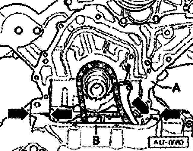- Position gasket on oil and grease free sealing flange -A- and place a small bead of sealant in corners (arrows).