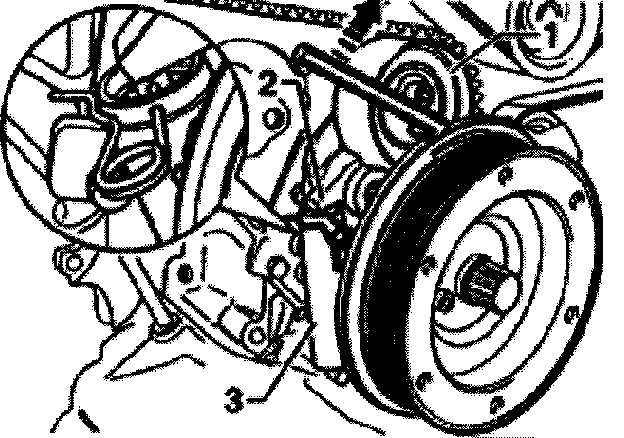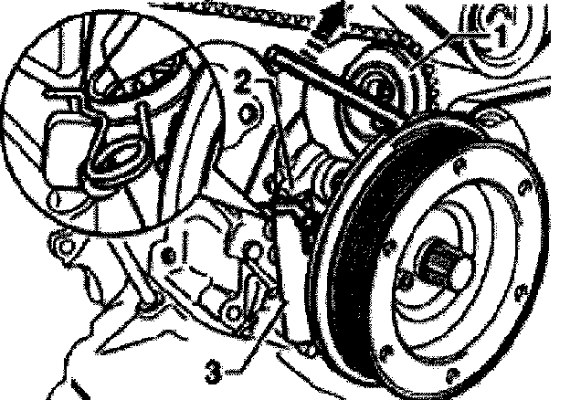 - Using 8 mm hex wrench, turn toothed belt tensioner roller-1 counter-clockwise, opposite direction shown (arrow), until tensioning lever 2- compresses tensioner -3- so that spring clamp (2 mm dia.) can be removed and then remove clamp.