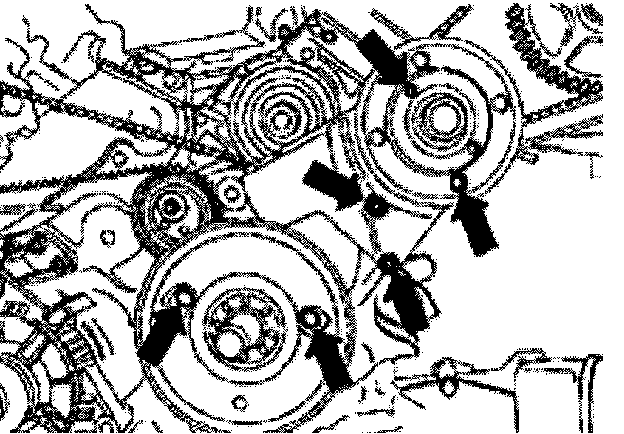 - Check position of camshaft sprockets. Larger holes in securing plate -arrows- must align opposite one another on inside.