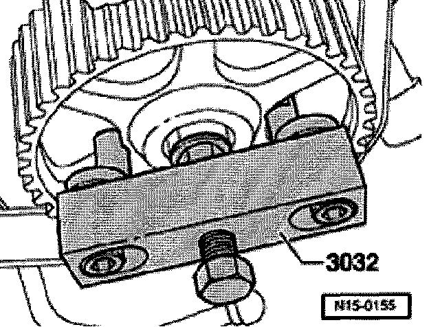 - Release camshaft sprocket with puller 3032. Then using securing bolts and securing plates tighten hand tight again.