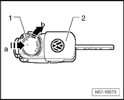 - Slide battery - 1 - in direction of arrow - arrow a - and remove key - 2 - upward - arrow b -.