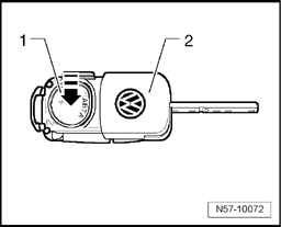 - Place battery - 1 - in key - 2 - with positive terminal downward in direction of - arrow -.