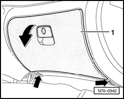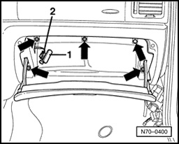 - Pull storage compartment on passengers side - 1 - out of instrument panel - arrow -.