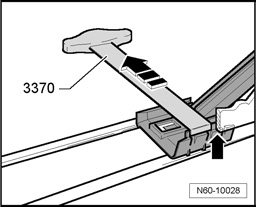 - Pull wind deflector bearing out of side locking mechanism of left and right guide rails using special tool Hook for front end 3370 in direction of - arrow -.