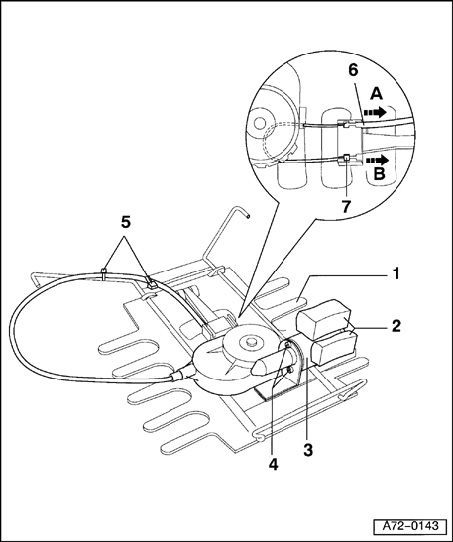 - Press together lumbar support body and disengage Bowden cable - 6 - in direction - arrow A -.
