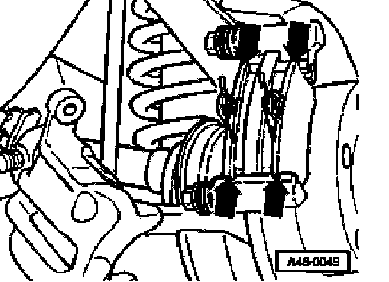 ^ Remove brake caliper housing and secure with wire so that the weight of the brake caliper does not stress or damage the brake hose.