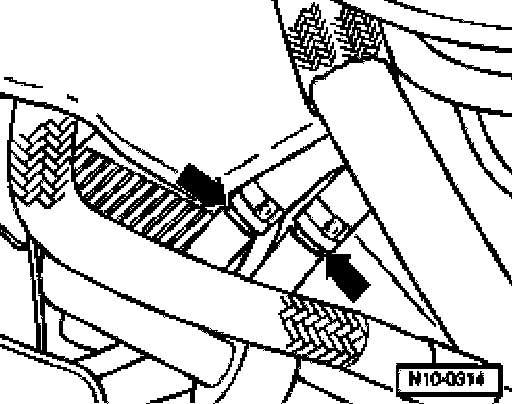 ^ Pull out retaining clip for upper coolant hose and remove coolant hose from quick-release coupling of radiator.