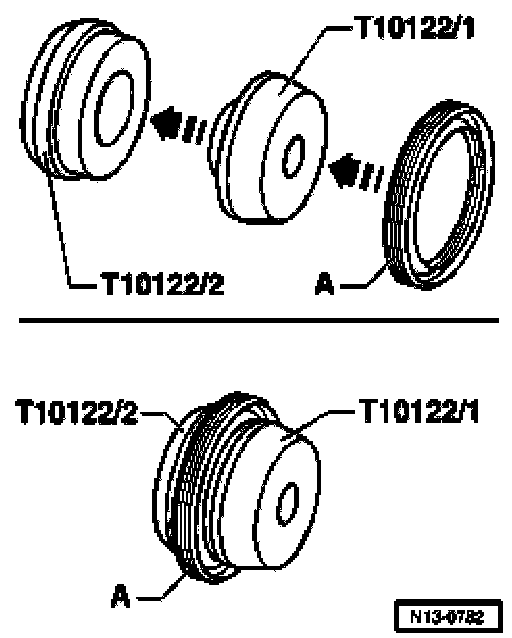 ^ Install assembly sleeves T10122/1 and T10122/2 together. Slide oil seal -A- until stop onto assembly sleeve T10122/2.