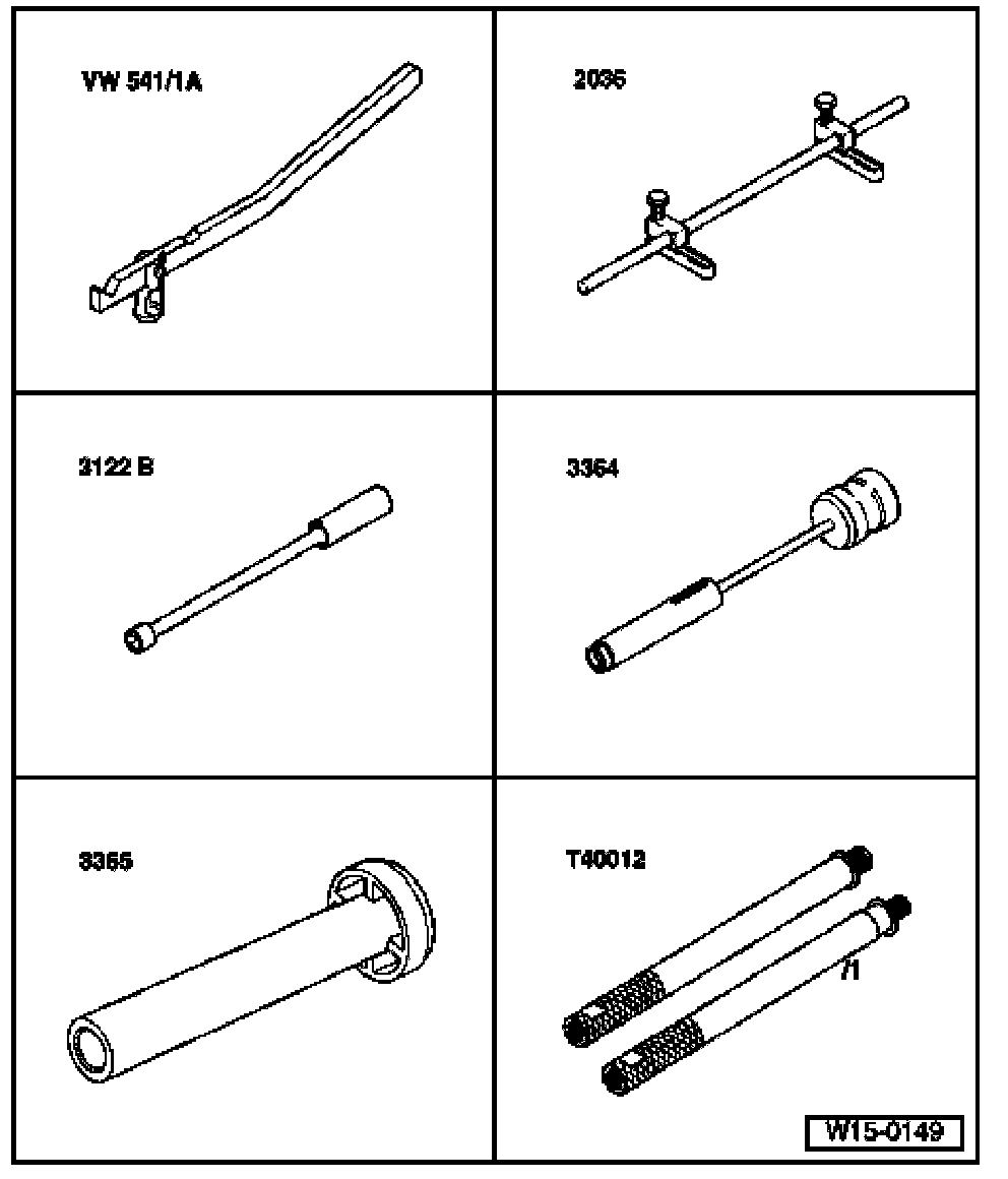 ^ Remove valve springs with valve lever VW 541/1A and thrust piece VW 541/6.