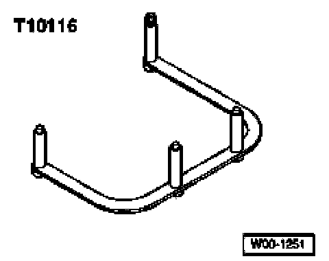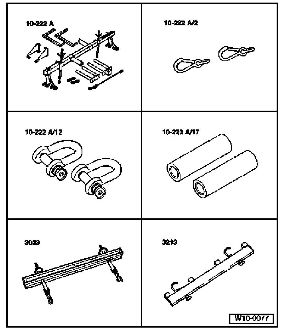 ^ Hook lifting tackle 3033 (item 2 and 11) into supplementary hooks 10222A/2 and lift slightly using workshop crane VAS 6100.