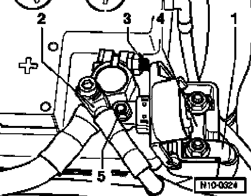 ^ Release line -2- and bracket -5-. Remove cable -3-, pull it through bulkhead and disconnect it from right-hand longitudinal member.