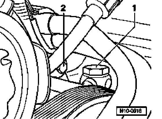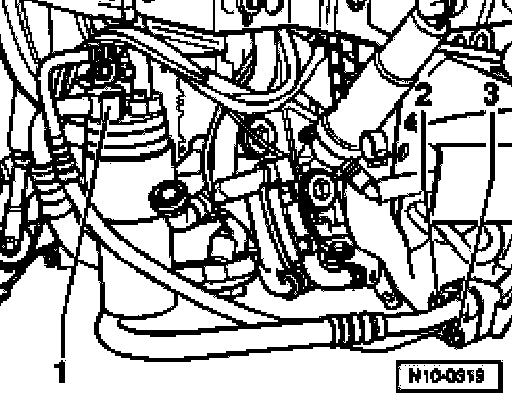 ^ Separate line -1- on pressure side of power steering pump and remove line -2-. Collect hydraulic oil which may leak out in a suitable container.