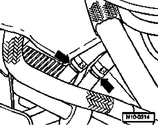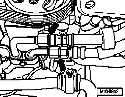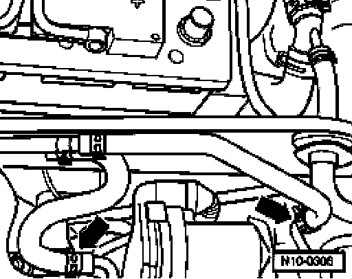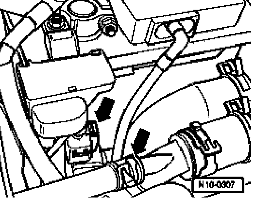 ^ Separate hose connections (arrows) between transmission oil cooler and lines to manual/automatic transmission and collect oil which may leak out in a suitable container.