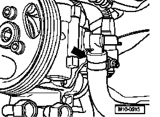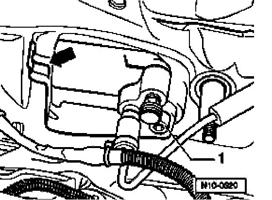^ Remove hose (arrow) on suction side of power steering pump and collect hydraulic oil which may leak out in a suitable container.