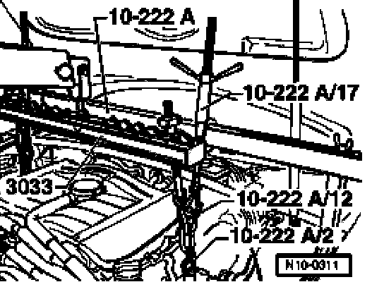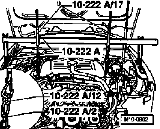 ^ Lower engine with transmission via support bracket 10-222A until following work sequences can be performed: