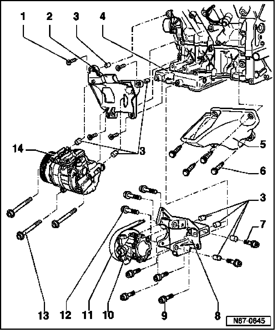 - The compressor bracket and related components must only be removed and installed after discharging refrigerant circuit. Use Kent-Moore ACR4 or equivalent.