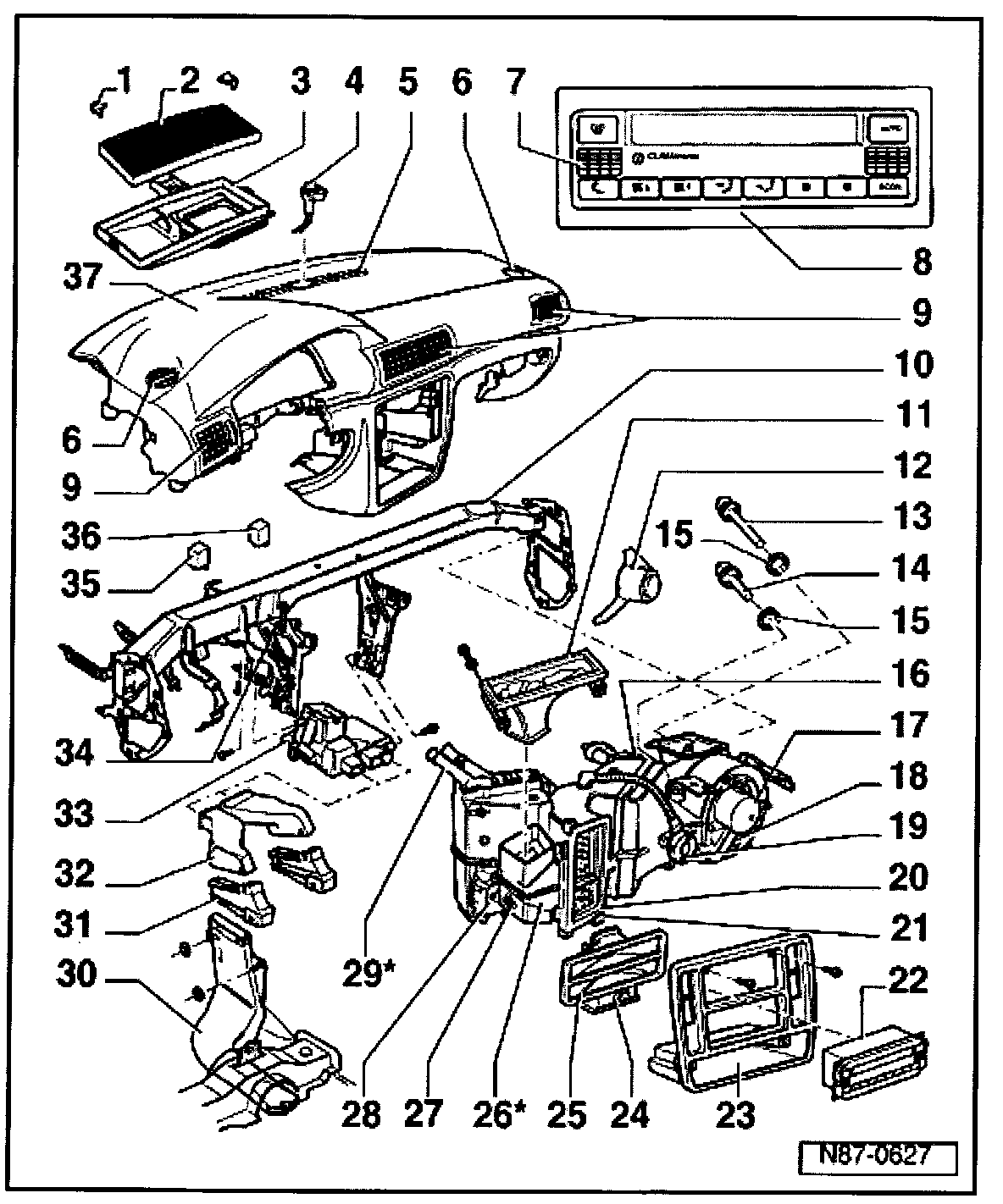 - Climatronic control module J255-, A/C control head - E87- and instrument panel interior temperature sensor -G56- with interior temperature sensor blower -V42- are integrated into a single unit and cannot be serviced separately.