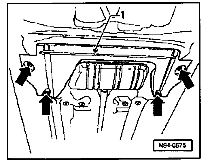 - Remove screw -1-, Torx screws -arrows- and remove rear suspension cover.
