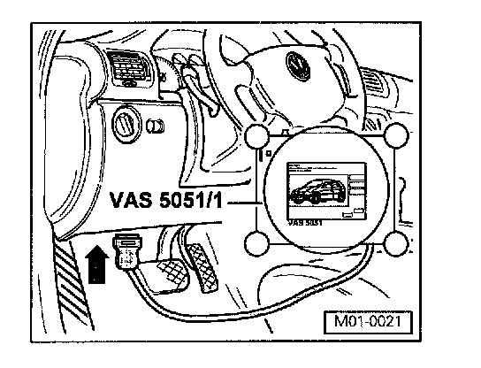 - Connect Scan Tool (ST) VAS 5051 using adaptor cable VAS 5051/1 or VAS 5051/3 as follows: