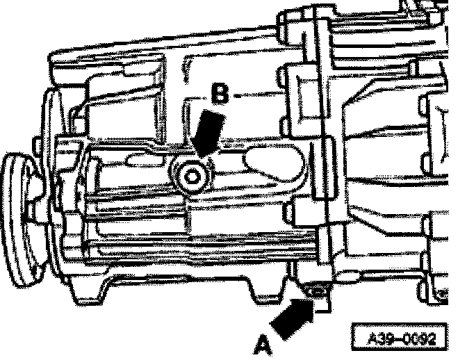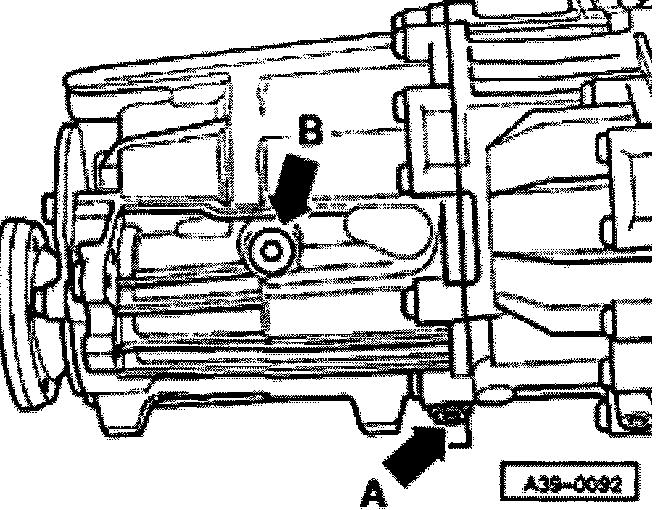 - When oil level is correct, seal center differential with new plug -arrow B-.