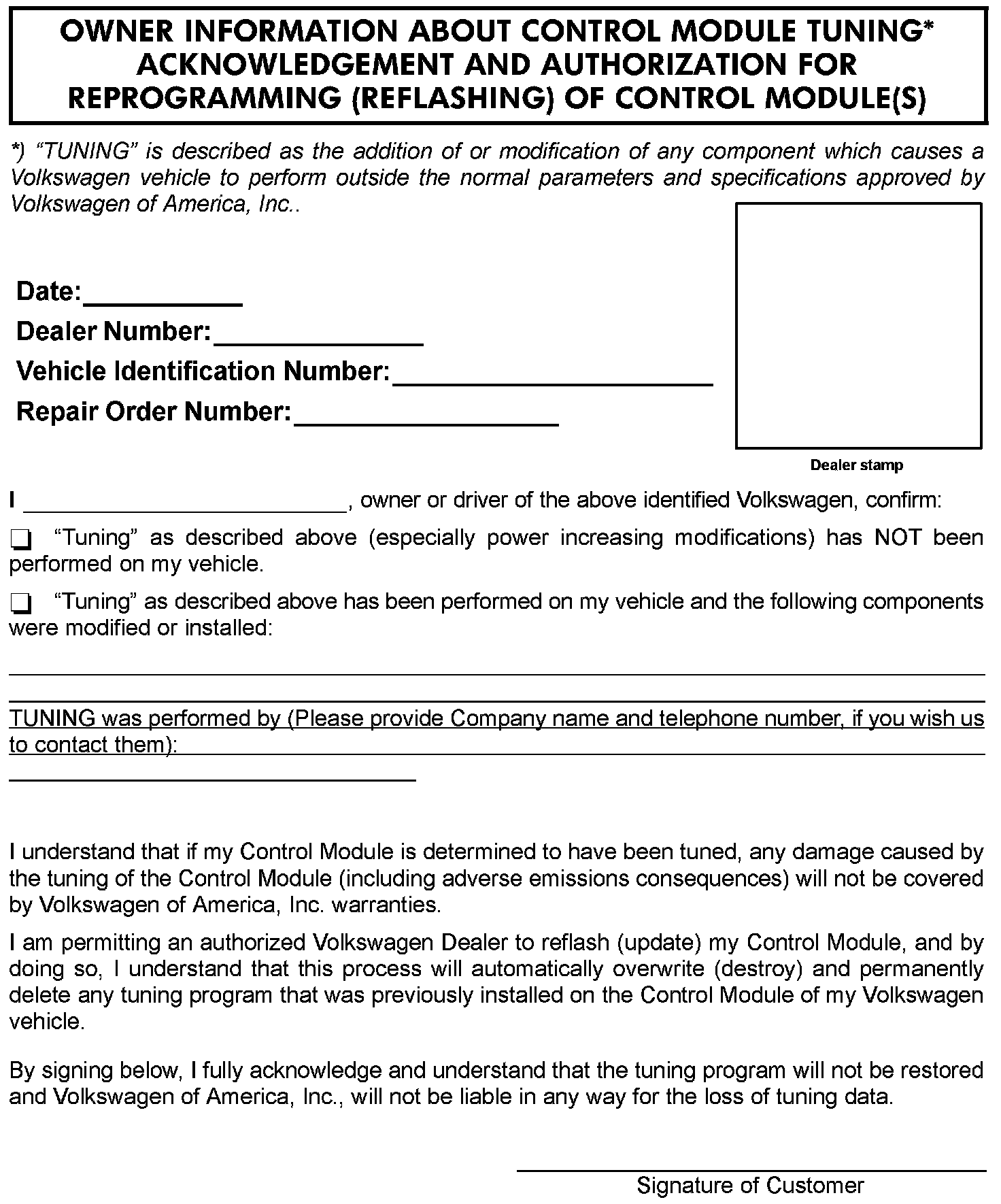 Your Dealership should place the vehicle owner on notice in writing, that their ECM was found to have been tuned, and that any damage caused by the tuning of the ECM (including any adverse emissions consequences) will not be covered by Volkswagen of America, Inc. warranties.