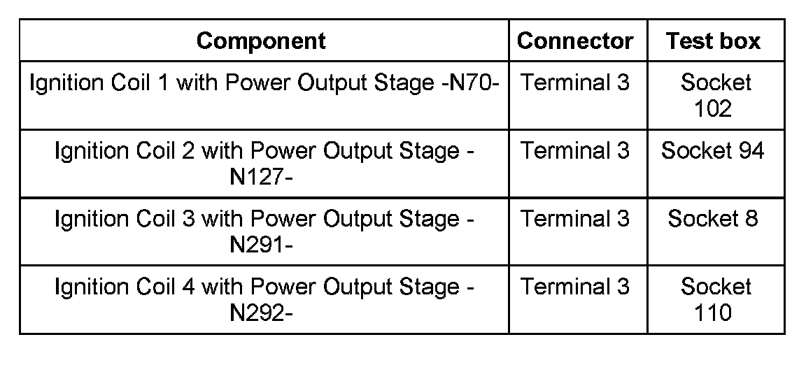- Using adapter cables, connect voltage test lamp to Terminal 3 + engine Ground (GND)of disconnected Ignition Coil 1 with Power Output Stage -N70-.