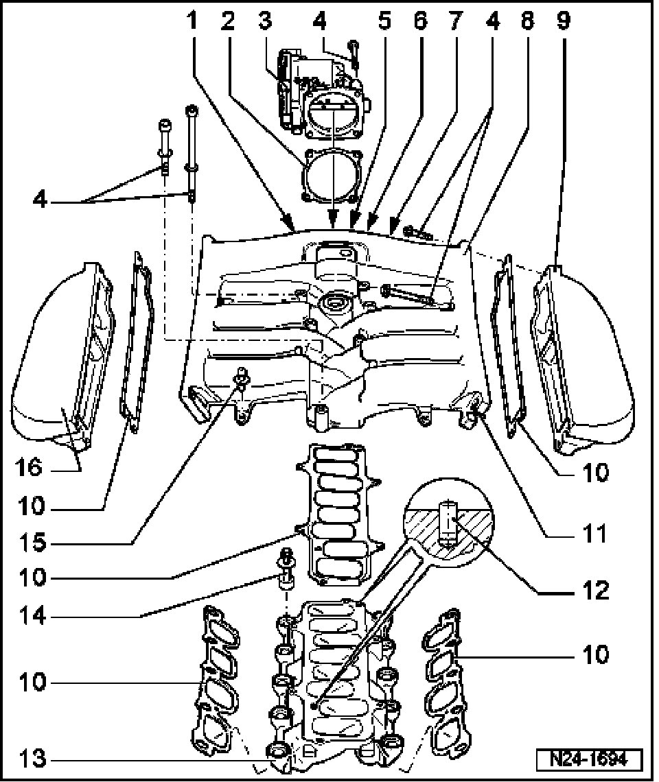 - When removing the upper part of the intake manifold (item 8 ), ensure that the alignment pins (item 12 ) are positioned in lower part of the intake manifold (item 13 ) and do not fall into the intake channels!