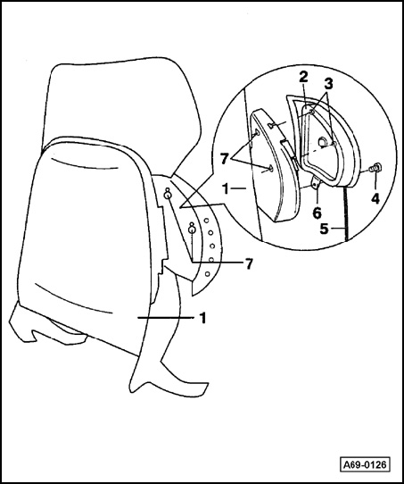 - Remove bolt - 4 - from tab - 6 - and backrest - 1 - (10 Nm).