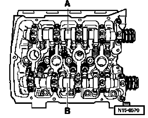^ Points of bearing caps -A- of intake and exhaust camshafts face outward.
