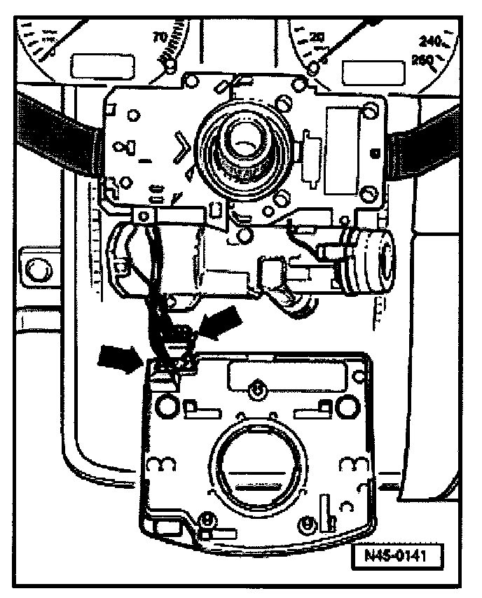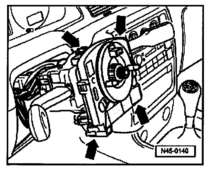 - Carefully loosen four fastening clips (arrows) and remove sensor for steering angle in steering column direction.
