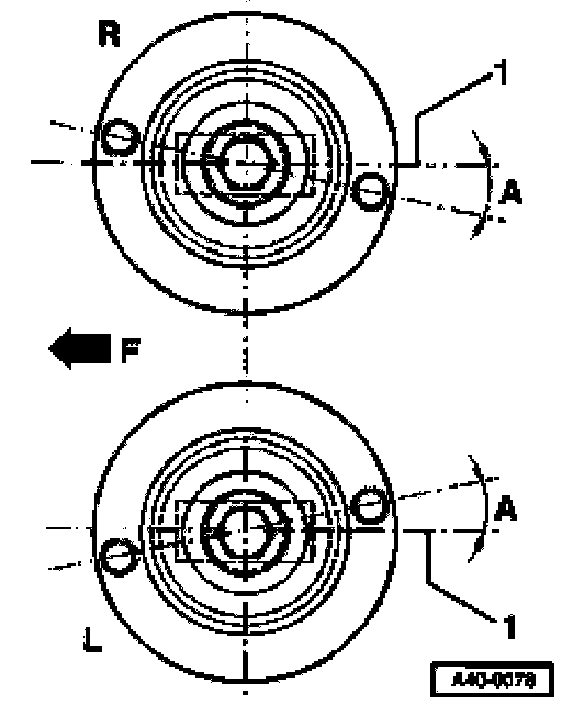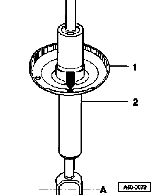 The hole -arrow- in spring plate -1- should be offset 90° to shock absorber-2- bolt axis -A-.