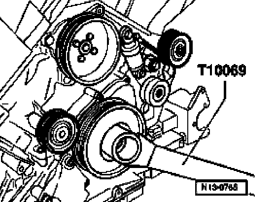 ^ Remove drive plate by locking vibration damper with counter-holder T10069.