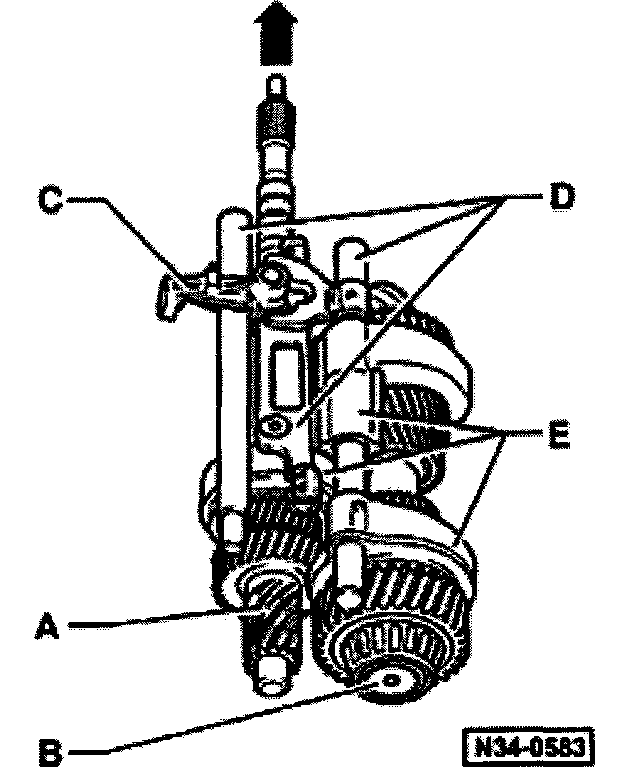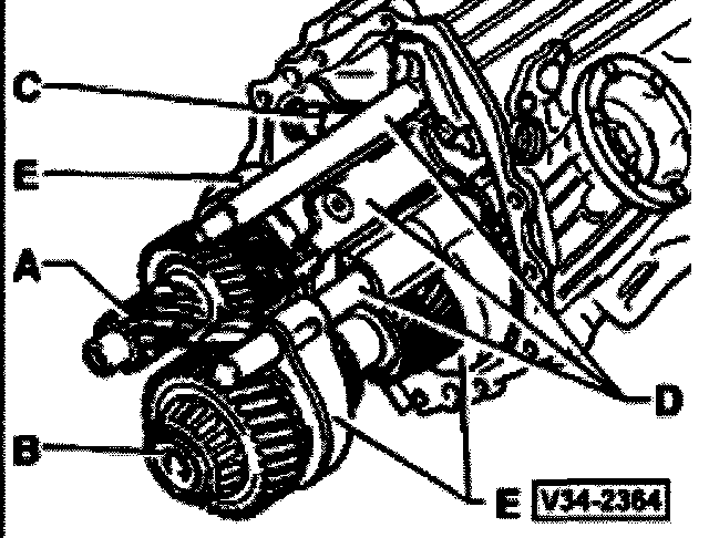 - The input shaft -A-, the pinion shaft -B-, the relay shaft -C-, the selector rods -D- with selector shaft and the selector forks -E- must be carefully pulled out together.
