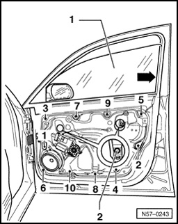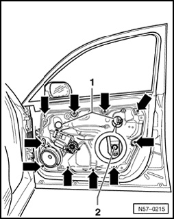 - Press door window - 1 - into window channel - arrow - and tighten clamping brackets with bolts - 2 -.