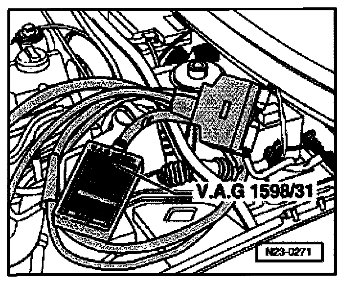 - Connect VAG 1598/31 adapter cable to control module wiring harness. Engine Control Module (ECM) is not connected.