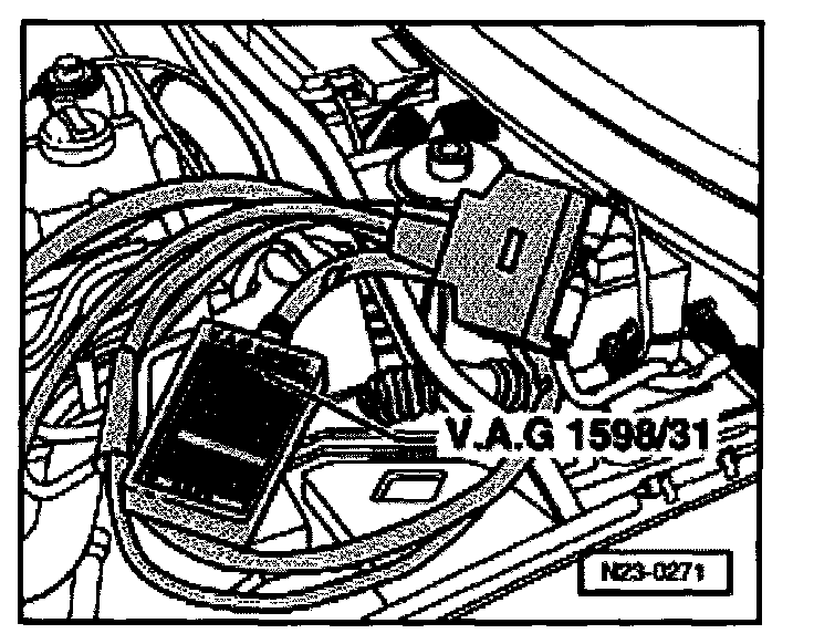 - Connect VAG 1598/31 adapter cable to control module wiring harness. Engine Control Module (ECM) is not connected.