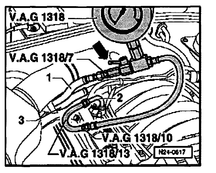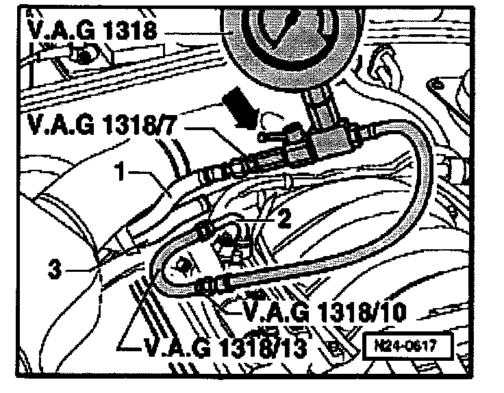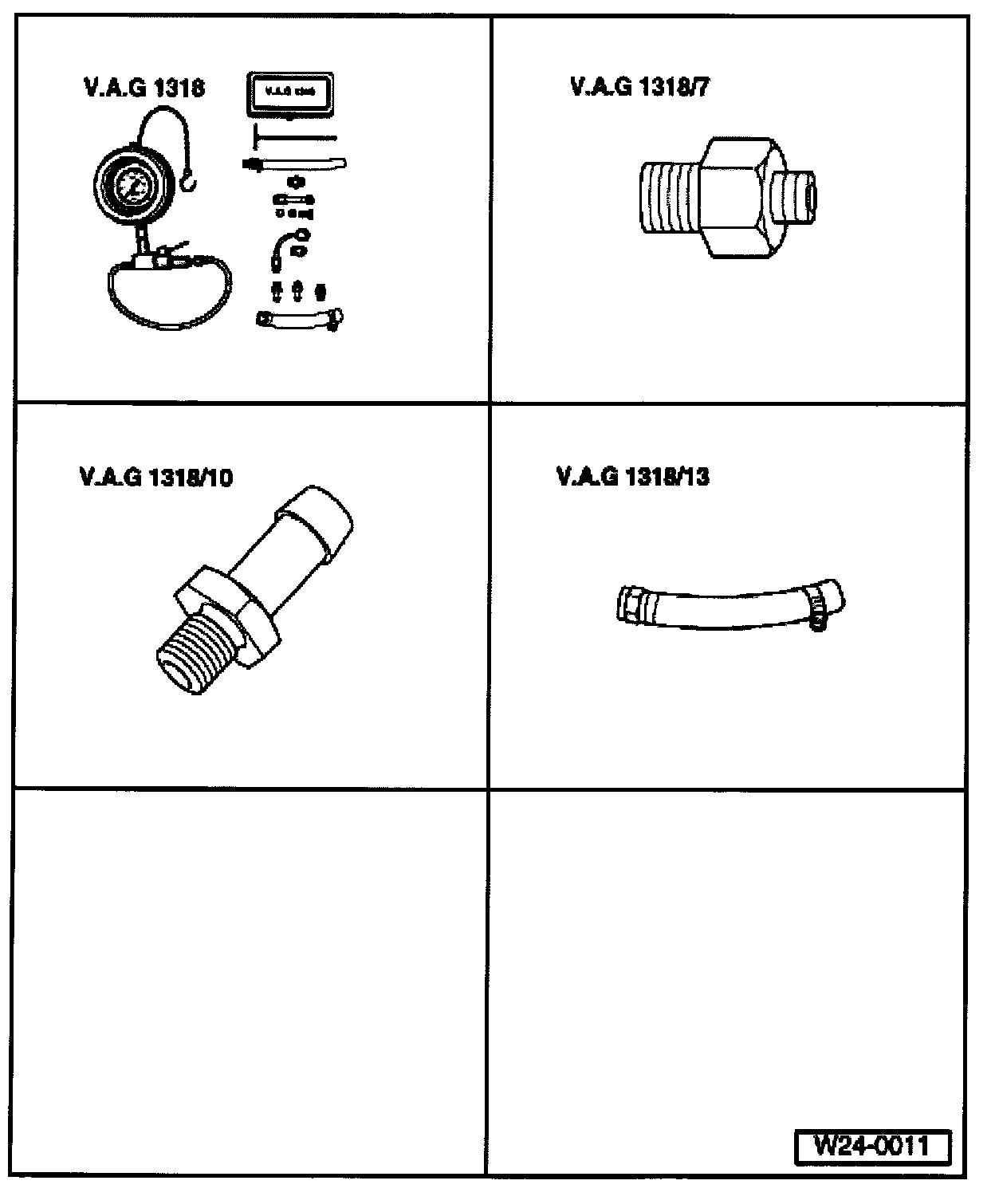 - Connect pressure gauge VAG 1318 with adapters 1318/7, /10 and /13.