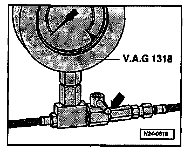 - Open stop valve of pressure gauge VAG 1318 (lever in direction of flow (arrow)).