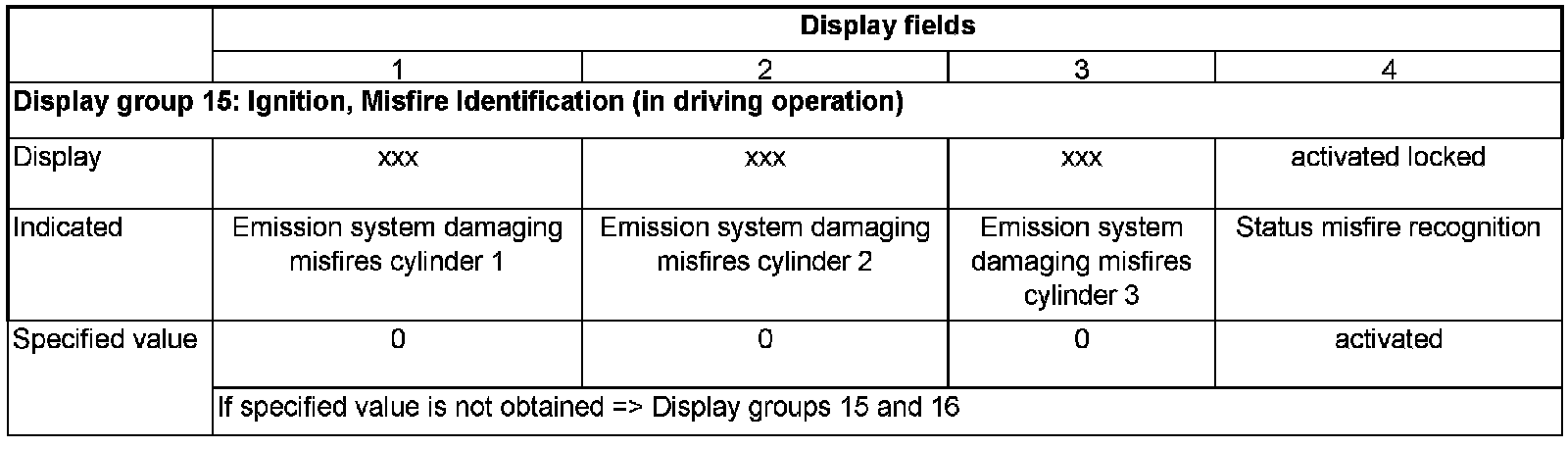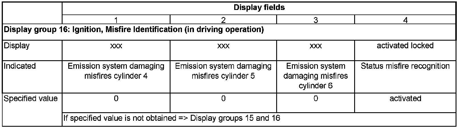 Evaluation of display group 15 and 16, display fields 1 - 3 -total misfires producing emissions cyl. 1- Cyl. 6