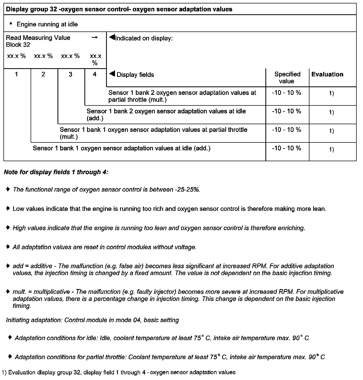 Evaluation display group 32, display field 1 through 4- oxygen sensor adaptation values