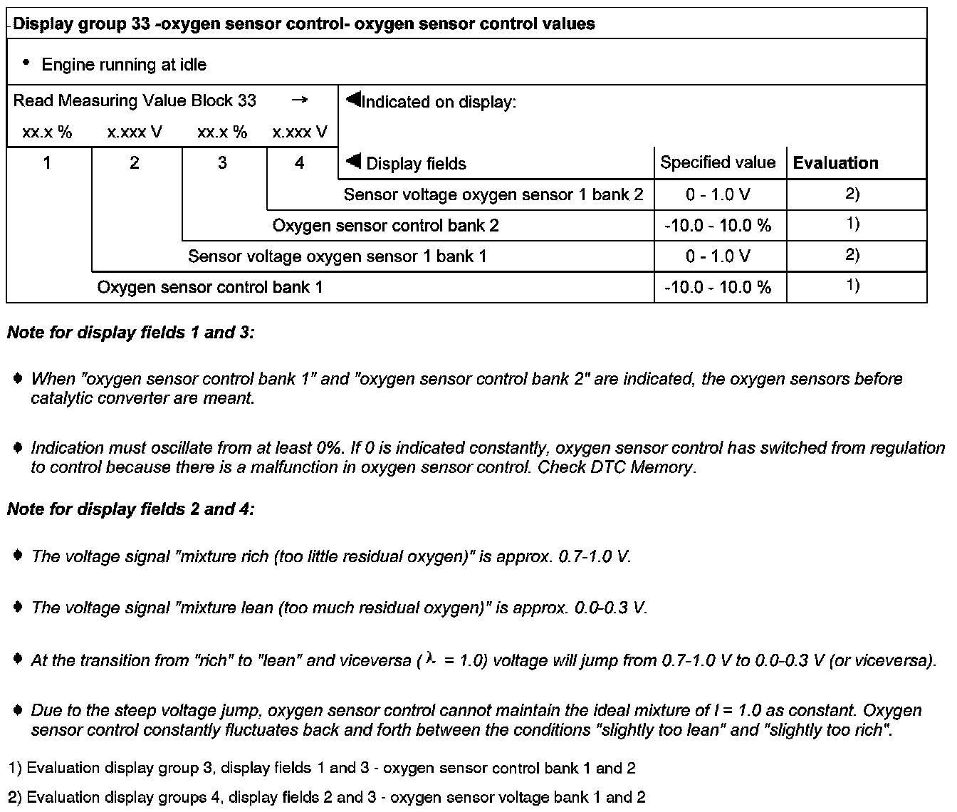Evaluation display groups 4, display fields 2 and 3 - oxygen sensor voltage bank 1 and 2