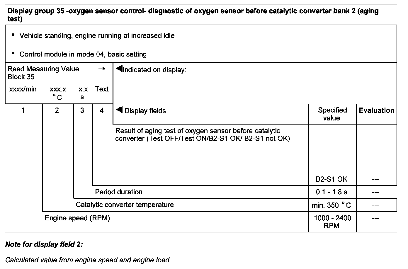 Display group 35 -oxygen sensor control- diagnostic of oxygen sensor before catalytic converter bank 2 (aging test)