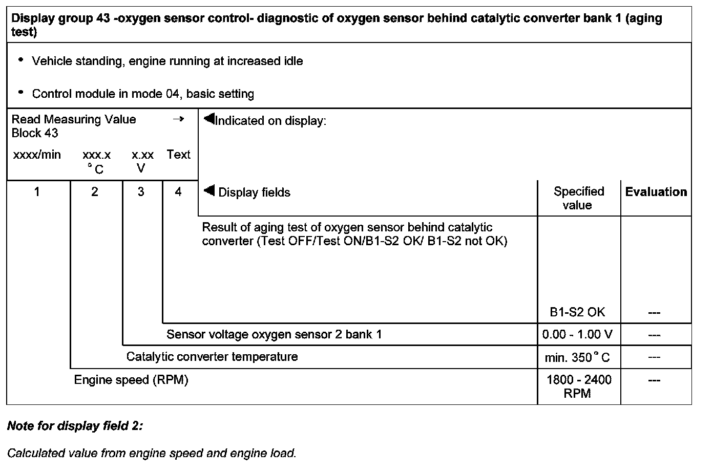 Display group 43 -oxygen sensor control- diagnostic of oxygen sensor behind catalytic converter bank 1 (aging test)