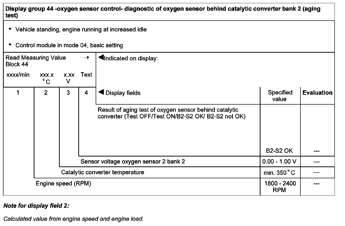 Display group 44 -oxygen sensor control- diagnostic of oxygen sensor behind catalytic converter bank 2 (aging test)