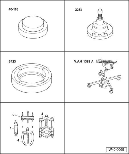 ^ Engine/transmission jack V.A.G 1383 A with universal transmission support V.A.G 1359/2