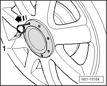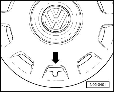 - Insert removal hook into one of the holes of the wheel center cap and pull in - direction of arrow -.