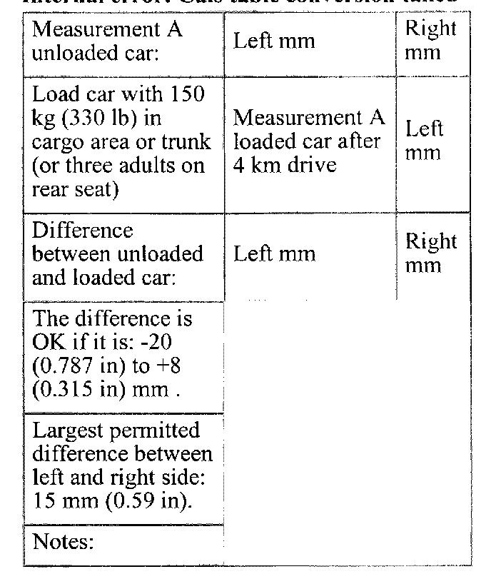 - Immediately measure the distance A again. The load of 150 kg (330 lbs.) or three adults should be in the car. The measurement should be the same as that obtained before adding the load. Add the measurements to the form and work out the difference. The difference is OK if it is: between -20 mm and +8 mm (- 25/32" + 5/16") from the original unloaded measurement. The difference between right and left may be maximum 15 mm (19/32").