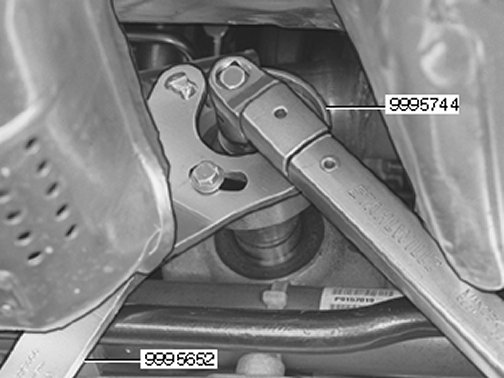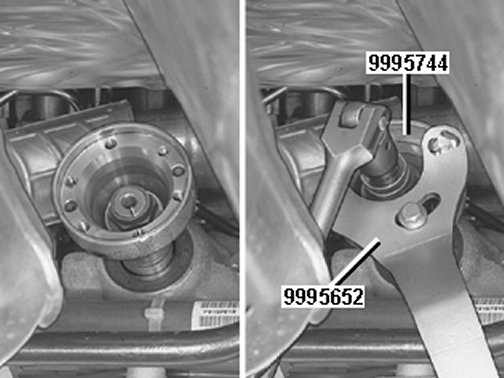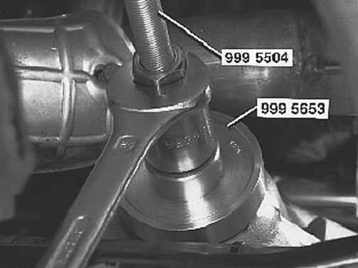 - the marked nut. Tighten to 180 Nm . Use counterhold 999 5652 including fitting ring 999 5744 . No axial play may be present.